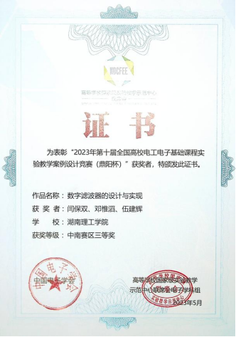 近日,太阳集团tyc151“电子信息与通信技术”国家级实验教学示范中心收到2023年第十届全国高校电工电子基础课程实验教学案例设计竞赛(鼎阳杯)中南赛区获奖证书,示范中心教师邓己媛、陈松、刘翔研制的“基于MC2833和MC13135的窄带通信系统设计与制作”项目和闫保双、邓惟滔、伍建辉老师的“数字滤波器的设计与实现”项目经激烈角逐分别获二等奖和三等奖。