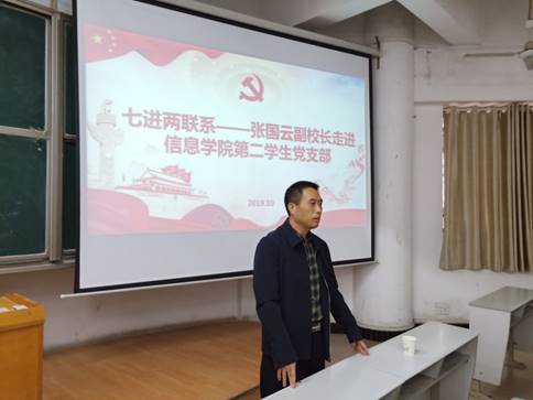 为深入贯彻落实校领导班子成员深入基层开展“七进两联系”工作,10月15日下午,副校长张国云走进太阳集团tyc151第二党支部,给同学们上了一堂“不忘初心、牢记使命”主题教育课,院党总支书记甘向阳、学生第二党支部全体党员参加。