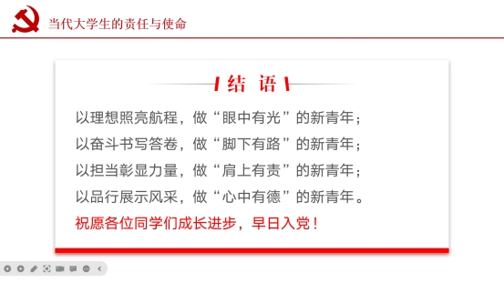 会议最后,夏玉宁对参会的各位入党积极分子提出殷切期望,希望大家做一个“眼中有光”“脚下有路”“肩上有责”“心中有德”的新青年。