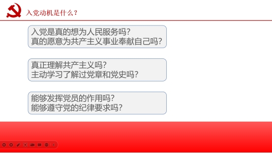 夏玉宁从“为什么选择入党”、“如何行动才能入党”、“当代大学生的责任和使命”三个方面为同学们讲解如何理清入党条件,端正入党动机,如何以实际行动争取早日加入党组织的怀抱。夏玉宁在讲解入党动机时,向同学们提出了“入党是真的想为人民服务吗?”“真的愿意为共产主义事业奉献自己吗?”“真正理解共产主义吗?”“主动学习了解过党章和党史吗?”“能够发挥党员的作用吗?”“能够遵守党的纪律要求吗?”六个问题,引发了同学们深刻的认识与思考。