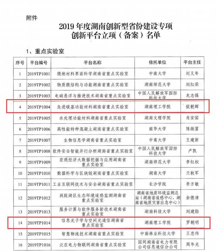 12月19日,湖南省科学技术厅发布了《关于2019年度湖南创新型省份建设专项创新平台立项(备案)的通知》,学校先进碳基功能材料湖南省重点实验室、信息光子学与空间光通信湖南省重点实验室成功入选。