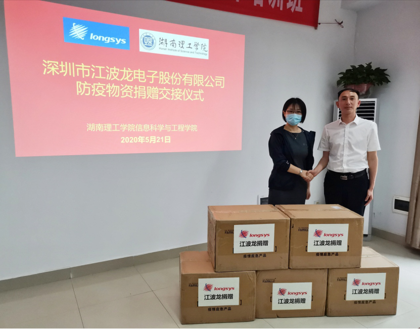 5月21日上午,受学校疫情防控办委托,我院优秀实习就业基地——深圳市江波龙电子股份有限公司爱心捐赠10000个防疫口罩交接仪式在逸夫楼16325会议室举行。公司人力行政部经理黄涛、学院院长李武出席。学院副书记徐丹主持,副院长童耀南、电子技术创新基地主任陈松、辅导员柳祎璇、荀仕杰等人参加。