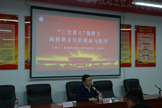 副校长徐振祥做了《“三全育人”视野下高校班主任的使命与担当》专题培训,介绍了我国高校班主任制度建立的历程,并从学校制度建设、个人角色认知、班主任与辅导员的良性互动关系等角度对高校班主任的认知进行分析,强调要将班主任工作落实到制度设计和人才培养上。他用生动感人的案例诠释了“三全育人”视野下高校班主任的职责与使命,强调一名优秀的班主任要始终以学生为主,贯彻落实“立德树人”的根本任务,做好“为谁培养人,培养什么人,怎样培养人”的具体工作。