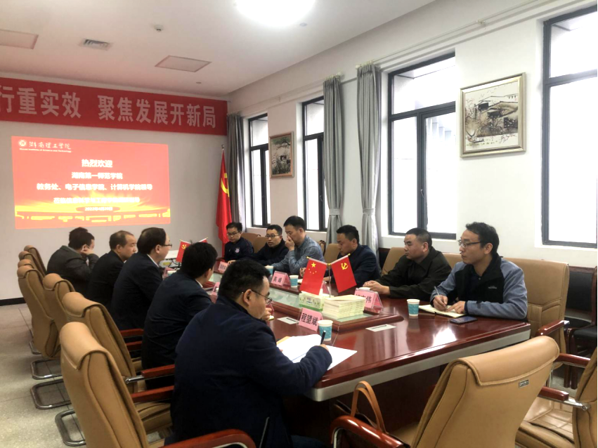 4月20日下午,湖南第一师范学院教务处副处长汤希玮、电子太阳集团tyc151院长高峰和计算机学院院长满君丰等领导及骨干教师一行6人来太阳集团tyc151调研交流本科人才培养工作。太阳集团tyc151院长童耀南,副院长严权峰、涂兵,教研室主任和实验室主任等人热情接待并召开座谈交流会。