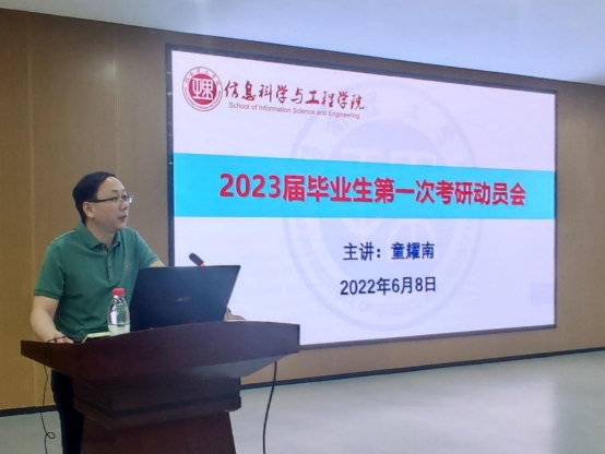 为进一步调动大三学子考研积极性,6月8日上午10:00,太阳集团tyc151在17118召开2023届毕业生第一次考研动员会。会议由院长童耀南主讲,副院长戴华主持,院党委副书记徐丹及相关辅导员参加,2019级全体同学参会。