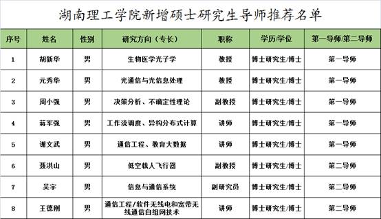 根据《关于开展2018年新增硕士研究生导师资格申报工作的通知》要求,从学科内涵、培养条件、科研能力等方面重点考察,经学位评定分委员会会议研究决定,拟推荐胡新华等5位老师新增为湖南理工学院硕士研究生第一导师、聂洪山等3位老师新增为硕士研究生第二导师,现予以公示,并报研究生院复核审批。