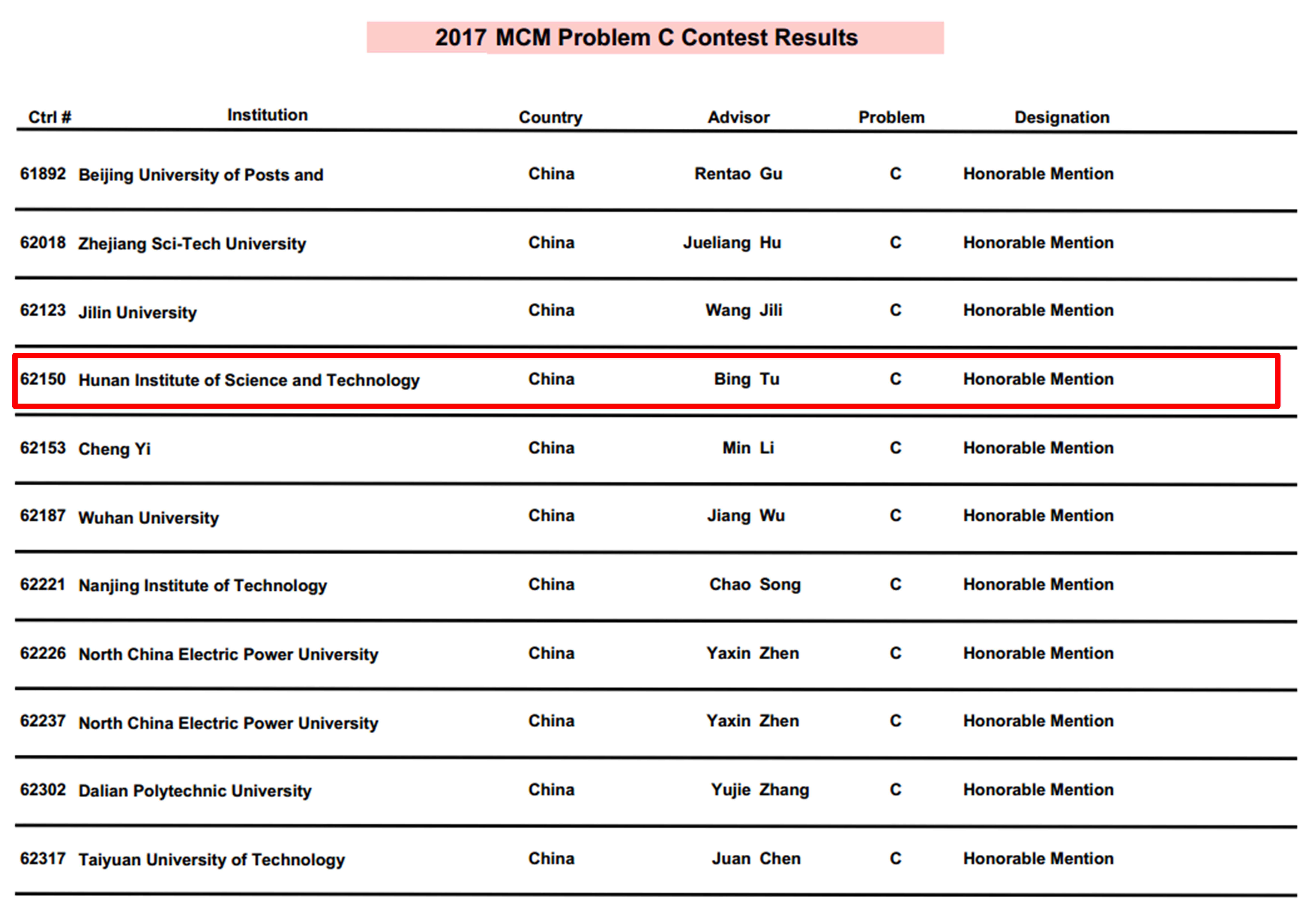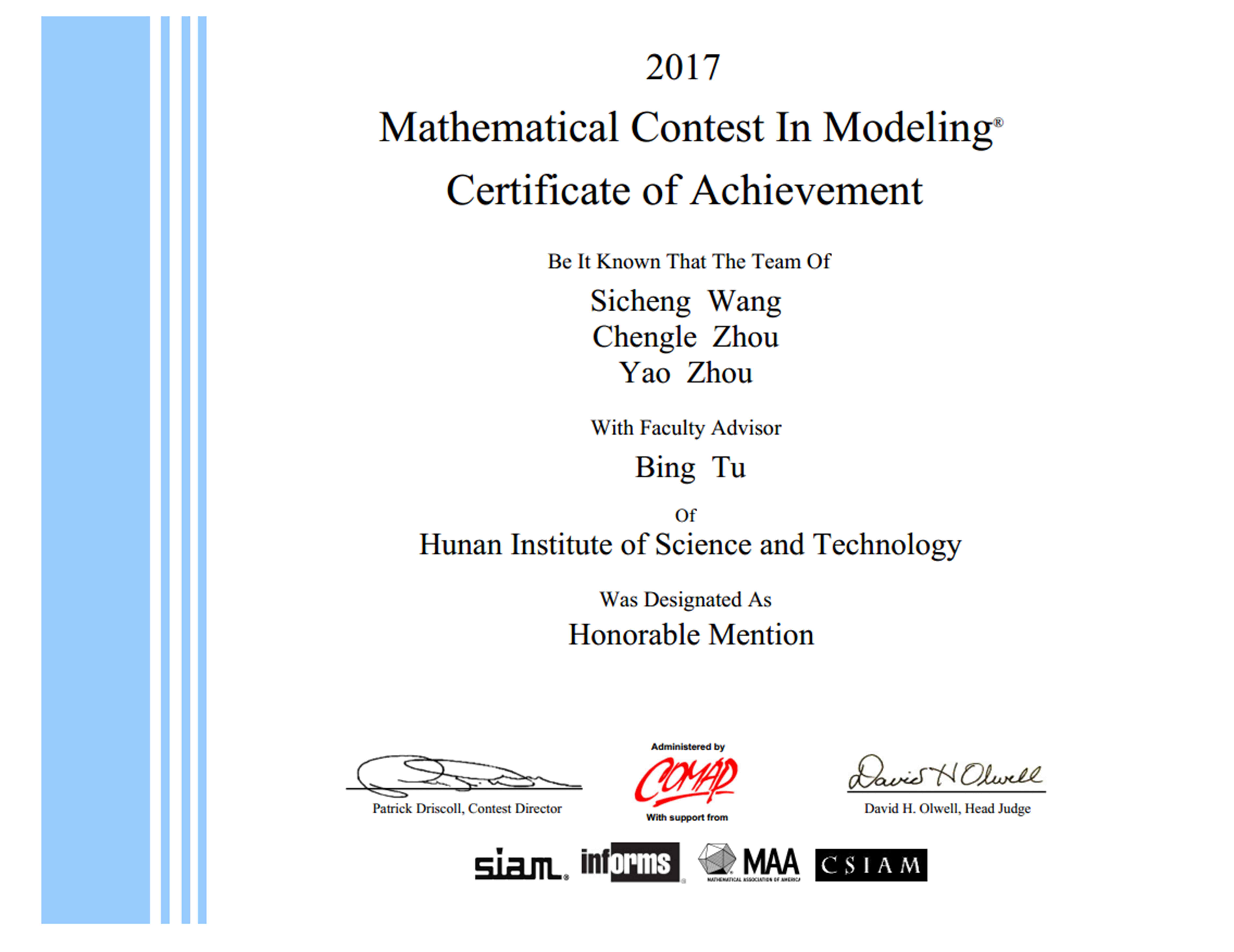 校园网讯 4月8日,2017年美国(世界)大学生数学建模竞赛(MCM/ICM)获奖结果揭晓,我院学生王思成(2013级自动化1班)、周承乐(2015级电气2班)、周瑶(2015级自动化1班)组成的参赛队伍首次斩获1项国际二等奖,指导教师系图像信息处理与智能系统校级科研创新团队成员涂兵博士。