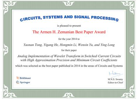 近日,我校信息与通信工程学院童耀南博士、李宏民教授与国家杰出青年基金获得者湖南大学何怡刚教授等人于2014年8月在国际权威期刊《Circuits, Systems and Signal Processing》发表的题为“Analog Implementation of Wavelet Transform in Switched-Current Circuits with High Approximation Precision and Minimum Circuit Coefficients”的学术论文获该期刊电路与系统领域2014年度最佳论文奖(Armen H. Zemanian Best Paper Award),并获奖金800美元。