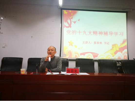 党总支书记张泰来简要回顾了党的十九大召开的时间背景,就十九大召开的行动指南、历史地位、主要精神以及当代青年党员的使命与责任分别做了阐述,并结合自身学习体会深入阐释了党的十九大精神内涵。他指出,中国目前的发展进入了一个新的时代,习近平总书记率领全党卓有成效地开展政治建设、思想建设、经济建设、文化建设、军队建设和生态建设,人民生活在党和国家的硕硕成果中也有了更高的层次追求,全体青年党员只有牢记为人民谋幸福、求发展的初心使命,坚持中国特色社会主义的伟大事业,才能早日实现中国梦想。