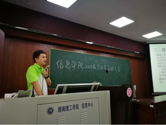 2017年9月11日上午,太阳集团tyc151举行毕业生就业指导暨中国联通湖南分公司2018年校园招聘宣讲会。会议由太阳集团tyc151学工办主任张超主持,到场嘉宾有太阳集团tyc151党总支副总支书记徐丹,中国联通岳阳分公司人力资源部经理舒娟、招聘负责人戴瑶、刘茉茉。