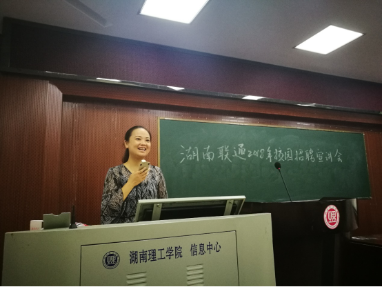 招聘负责人戴瑶主持了中国联通湖南分公司的宣讲会,她结合自己的从业经历,通过视频向在座学生介绍了湖南联通公司的发展历程,并讲述了联通公司各类补贴、保险福利以及招聘要求等情况。在与现场14级学生互动的过程中,她对信息学子的踊跃应聘表示热烈欢迎。