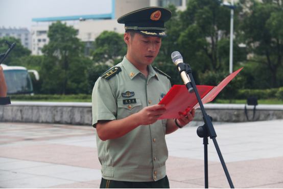 体育学院蔡志达同学作为新生代表在国旗下宣誓:不忘校训,遵守纪律,服从指挥,互相督促,共同提高。他代表全体新生们保证,本次训练将会尽心、用心、全心,展现新生最佳风采。