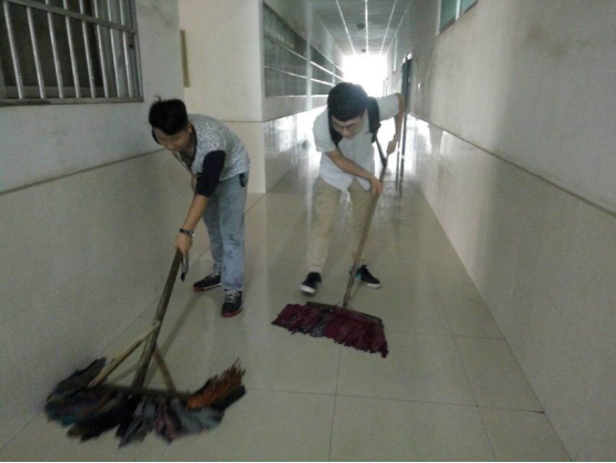 本次的清洁工作主要在16栋教学楼进行,6层楼的长廊与卫生死角显然不是轻微的工作量,每层楼的小组人员都使着十二分的力气:扫地、拖地、擦洗玻璃甚至是去除墙上的积灰都考验着大家的耐心与细心。