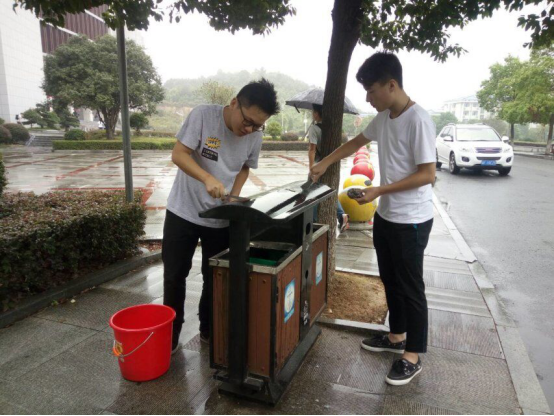 而在微雨中,集中负责清理图书馆到15栋校园小广告的同学们也没有丝毫怠慢,每个角落的广告纸都是他们行动的目标。大到教学楼的墙壁,小到路旁的垃圾桶,难以铲除的广告纸零散地分布在校园四处,而义务清洁者们细致负责的工作态度却让路边的风景再次变得整洁亮丽起来。