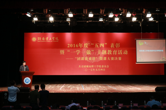 2017年5月4日晚七点,湖南理工学院2016年度五四表彰暨“一学一做”主题教育活动――“团课我来讲”微课大赛决赛于东院演播厅成功开展。出席本次表彰大会的领导有校党委书记李明,校党委委员、副校长徐小立,校党委宣传部部长王庆华、校党委学工部部长徐振祥、校教务处处长瞿述等教师代表,我院党总支副书记徐丹应邀出席大会。