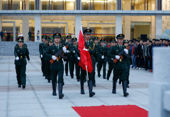 学校领导、学工部及各学院相关领导、老师和学生代表参加了此次升旗仪式。升旗仪式中,中文学院王思琪同学作为学生代表上台发言。她首先表达了对祖国和国旗的尊敬、自豪与热爱之情,后激励同学们牢记校训,努力学习,奋发图强。