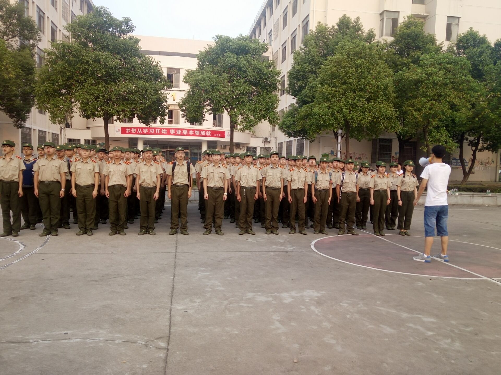 随后八点,教官们来到军训场地开始正式的军训。此时此刻,站在毫无荫庇的篮球场上,骄阳似火,晒不干同学们的热情,他们挺得笔直的腰杆透着一股军人的力量,支撑着他们站立在操场上不退缩、不畏惧。