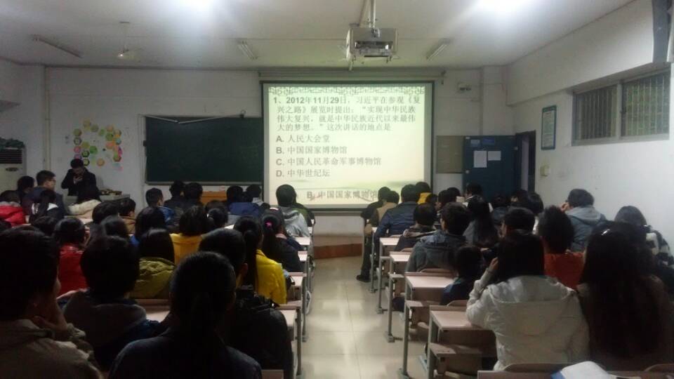 主持人阎永韬宣布活动开始,并讲述竞赛规则。赛题共分为选择题、简述题和抢答题。每个班的上场顺序由抽签决定,并两两对抗。比赛刚刚开始各组都跃跃欲试,尤其是到了抢答题更是积极举手回答。在每组队员回答问题时,下面都自觉的安静下来,待回答完宣布结果时都给予热烈的掌声。