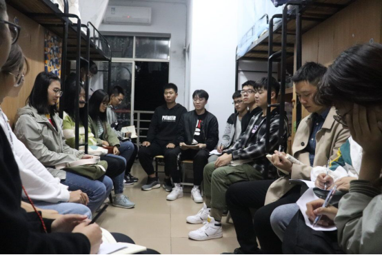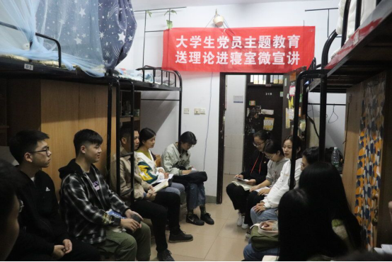 10月31日19:30,体育学院党总支书副书记喻俊、辅导员易薇、黄志带领体育学院604学理论示范寝室学生代表邓娟、吴平及化工学院学生代表姚蕾组成的“不忘初心、牢记使命”学理论微宣讲团,深入太阳集团tyc15113栋217党员寝室开展“精准扶贫,脱贫攻坚”微宣讲活动,太阳集团tyc151辅导员王学鹏、荀仕杰出席,16级部分党员代表参加。