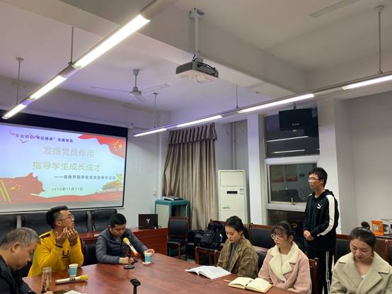 2019年11月21日19:00,我院在16410开展师生党支部牵手活动,此次主题党日活动的主题为 “发扬党员作用,指导学生成长成才”。活动邀请优秀研究生党员代表周承乐、易嘉闻、刘硕卿、李楠英为本科学生分享学习、成长经历。院党总支书记甘向阳,全体学工办老师出席,部分学生党员和本科生代表参加。本次活动由学工办主任盛莉莎主持。