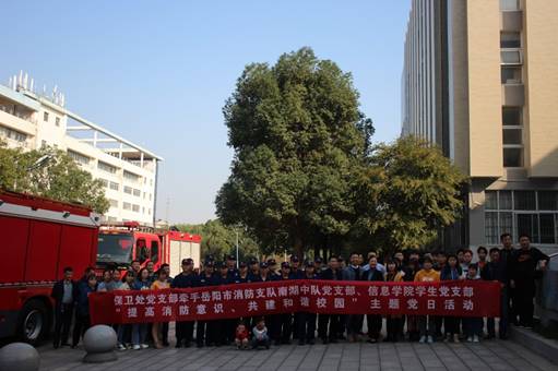 11月23日14:00,太阳集团tyc151学生党支部与岳阳市消防支队南湖中队党支部、校保卫处党支部牵手联合开展 “提高消防意识、共建和谐校园”主题党日活动。岳阳市消防支队南湖中队党支部书记何健、校保卫处处长姜剑鸣、副处长谭良机、我院党总支副书记徐丹、教工第一党支部副书记盛莉莎、学生第三党支部书记王学鹏参加活动。