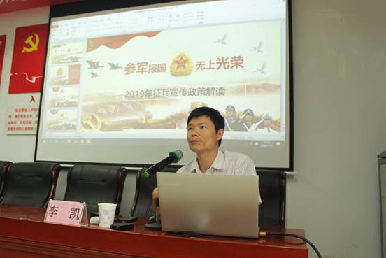 李凯首先从政治和经济两方面给同学们分析了当今大学生参军入伍的形势,他讲到,作为大学生要把个人发展与国家发展相结合,积极响应国家号召,顺势而为,到祖国需要的地方去,到人民需要的地方去,正视挑战,争先报效祖国。接着,他用往年我校同学在部队发展的案例详细介绍了入伍的发展与收获,鼓励同学们在部队中仍要保持先进性,争取通过军校考试和提干考试,不断提升个人价值。