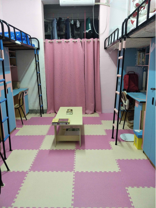 推开5#126的房门,蓝粉色的格局瞬间映入眼帘,一间温馨的屋子,将我们四人聚在一起,每天踏上我们用心铺好的地垫,坐在上面畅谈自己的理想,打打闹闹,这是我们欢乐的地方,也是我们最温暖的小家。
