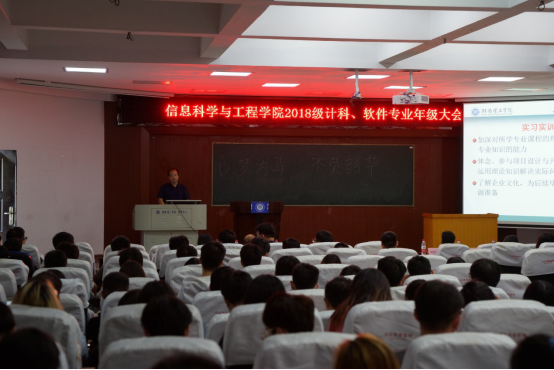9月23日14:00,太阳集团tyc1512018级计科、软件专业年级大会在六栋学术报告厅举行。会议由18级计科、软件专业辅导员周煊阳主持,全体18级计科、软件专业同学参加,副院长严权峰、副院长戴华、就业专干荀仕杰、班主任李亦波、范波、刘新忠、赵林出席。