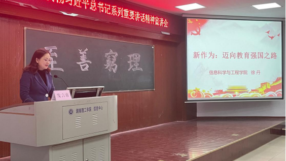 11月23日13:00,信息学院举行学习习近平总书记系列重要讲话精神专题宣讲会,院党委副书记徐丹主讲。学工线全体辅导员、院团学干部干事参加会议。