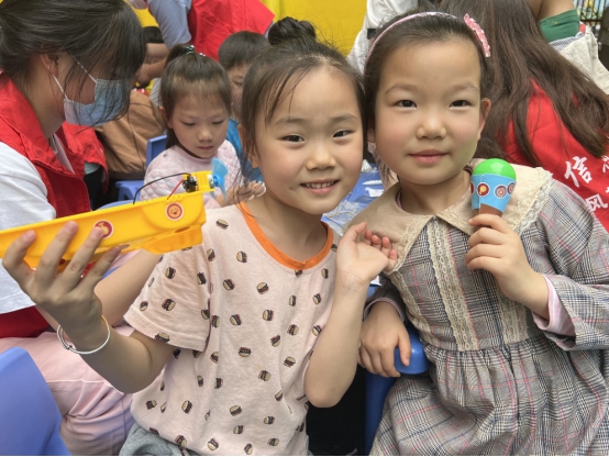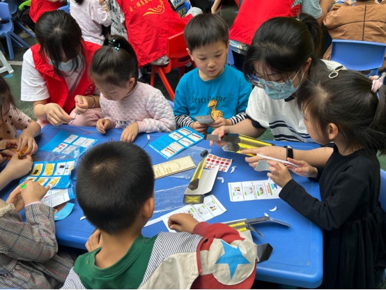 志愿者们提前到达学院路幼儿园准备手工材料、布置会场。小朋友们发挥想象,和志愿者们相互配合,分工协作轻松完成了各种各样新奇的手工玩具。