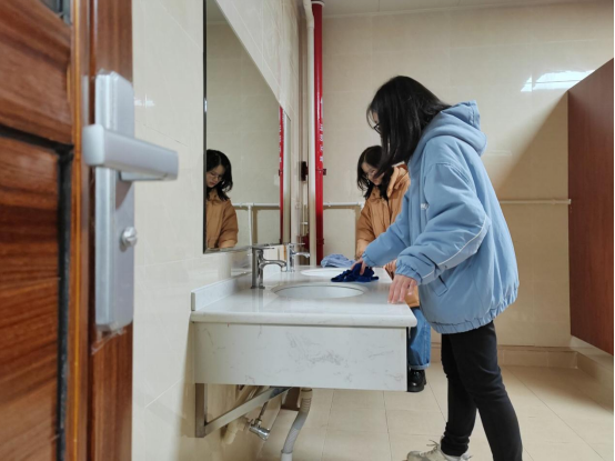 尽管天气寒冷,但大家的劳动热情依旧高涨。同学们分工明确,有的打扫楼道,有的打扫卫生间,有的擦窗,大家充分发扬不怕苦、不怕脏的精神,不放过任何一个卫生死角,各个忙得不亦乐乎。