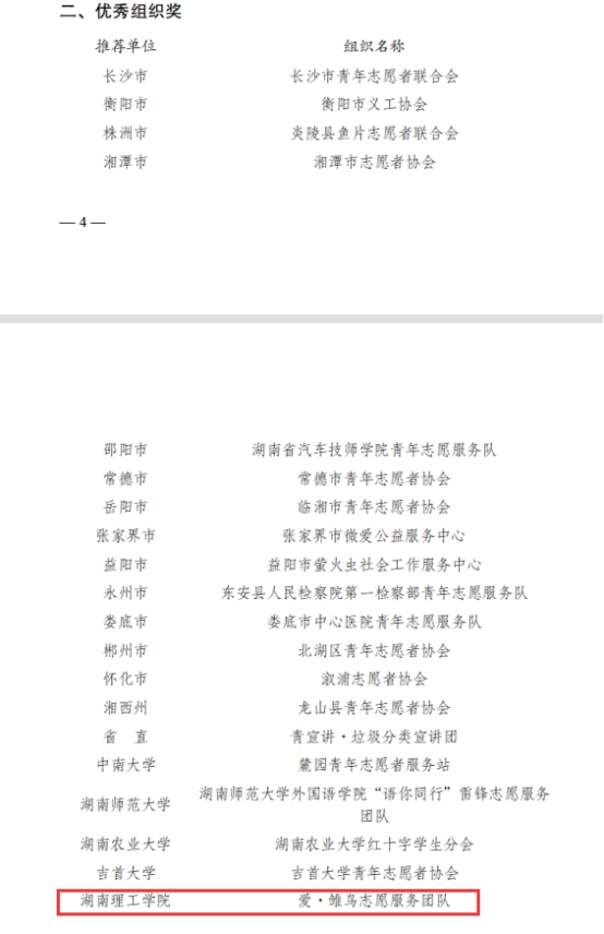 太阳集团tyc151爱·雏鸟志愿服务团队荣获2022年湖南青年志愿者“优秀组织奖”,此次获奖也是全省学院层次高校唯一获奖单位。