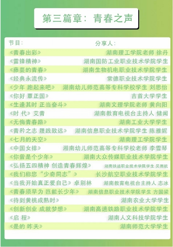 为贯彻党的二十大关于“推进大中小学思想政治教育一体化建设”的战略部署,深入学习习近平新时代中国特色社会主义思想,进一步推动广大青年传承红色基因、激扬青春力量,由湖南省委教育工委主办、湖南教育电视台承办的“奋斗青春号”大思政课堂于五四青年节当天,开启全省“青春分享会”超长直播活动,陪广大青年学生一起过节。