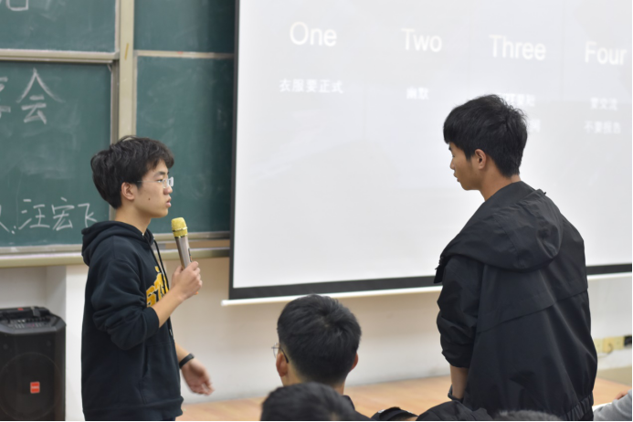 沈亚辉和赵卓则结合自己的参赛经历,为新生科普“大挑”即“全国大学生课外学术科技作品竞赛”。沈亚辉分享了如何组建优秀团队的经验,赵卓则指出了导师和课题的重要性。他们表示参与“挑战杯”竞赛是一次证明自己能力的机会,希望同学们可以不负韶华,把握机遇。