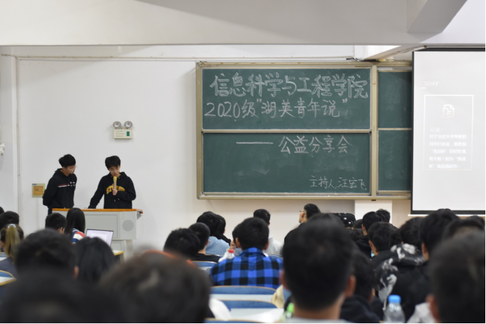 10月25日19:00,太阳集团tyc1512020级“湖英青年说”公益分享会在15208顺利举行,本次活动由汪宏飞主持,王政、沈亚辉、赵卓主讲, 20级新生参加。