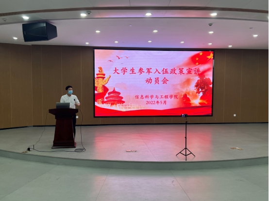徐丹在总结了参军入伍的优惠政策,并强调三个到位:一是认识到位,要从讲政治的高度认识到征兵工作是加强国防和军队建设的一项基础工程,带有政治性、全局性和战略性;二是宣传到位,以年级、班级、寝室为单位做到全覆盖宣传;三是落实到位,学院会进行分类指导,精准对接,希望老师同学们把爱国热情转化为支持国防和军队建设的实际行动,营造“一人参军,全家光荣”的良好氛围,形成“人人关心征兵工作,人人支持国防建设”的良好局面。